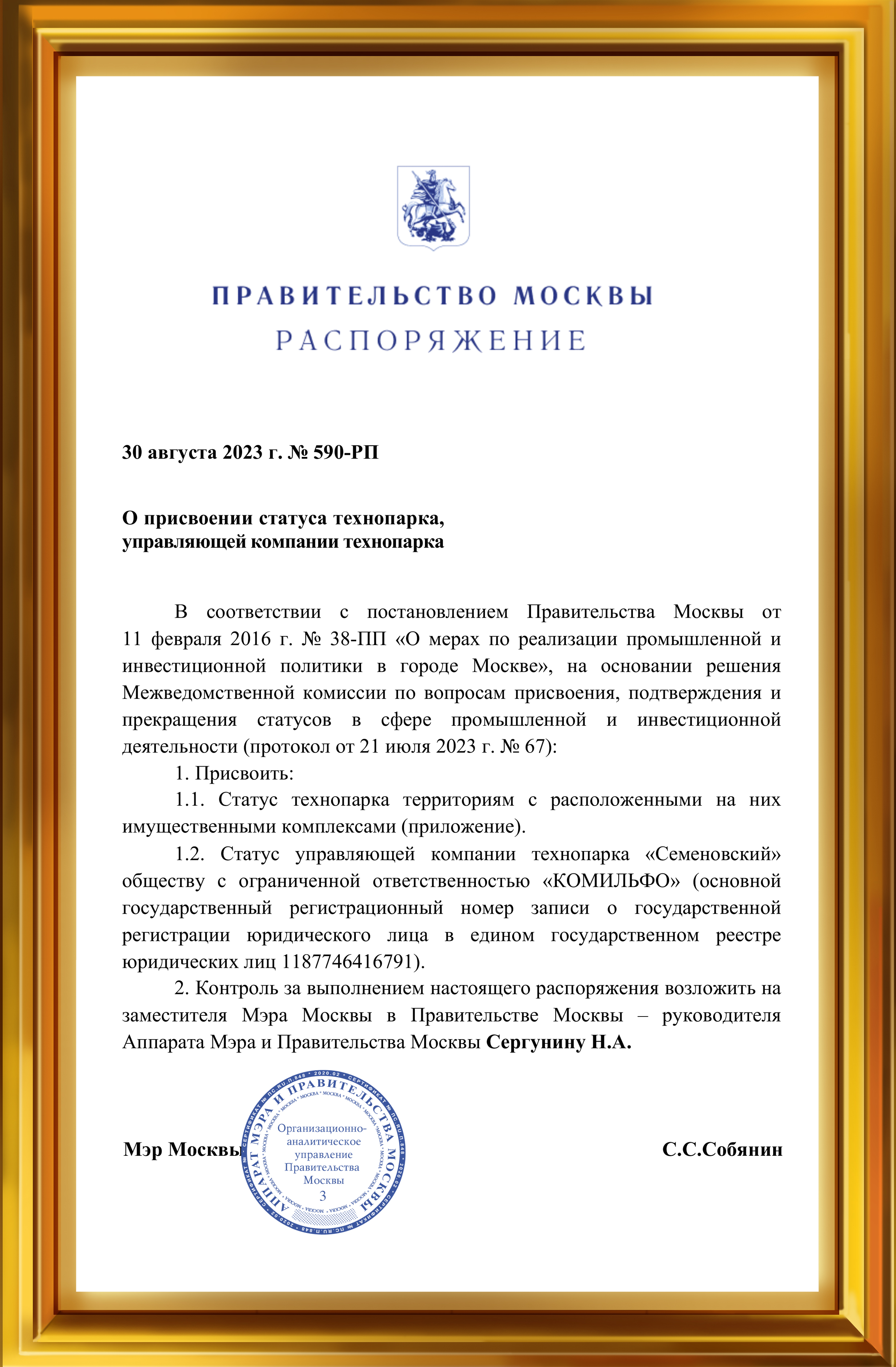 Мэром города Москвы 30 августа 2023 года Бизнес-центру «На Семёновской» был присвоен статус технопарка.